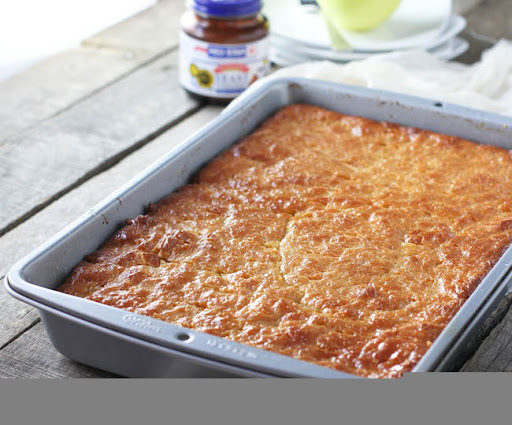 Place a large serving platter over the top of the baking dish and carefully invert. Cut cake into squares and serve warm or at room temperature.
