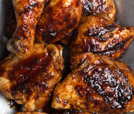 Brush generously all over with some of sauce, then move chicken directly over coals (turned-on burners if using gas). Grill chicken, covered, turning and moving to area with no coals or heat underneath if flare-ups occur, until browned, 3 to 5 minutes more. (Add more charcoal during grilling if necessary to maintain heat.)