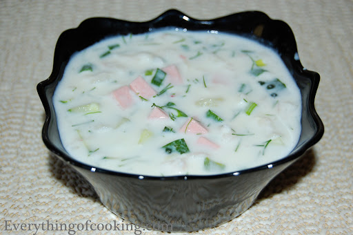 Dice the cucumbers, eggs, sausage and potatoes. Put them in a large pot.
