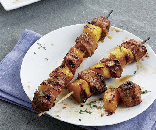 Thread the pork and mango cubes onto the skewers, alternating them and beginning and ending with a piece of pork. Each skewer should have about 5 pieces of pork and 4 pieces of mango.