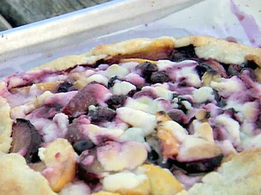 Cut the peaches and plums in wedges and place them in a bowl with the blueberries. Toss them with 1 tablespoon of the flour, 1 tablespoon of the sugar, the orange zest, and the orange juice. Place the mixed fruit on the dough circle, leaving a 1 1/2-inch border.