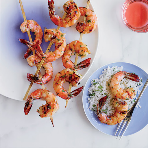 Thread the shrimp onto 4 skewers and rub the butter all over the shrimp. Oil the grate. Grill the shrimp over moderate heat, basting with the marinade and turning, until just cooked through, 7 minutes. Serve with steamed rice.