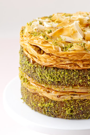 1. Level top of the cakes with serrated knife to remove indent in the center of cake. Place one cake layer on cake stand or plate, brush top of cake generously with syrup. Place a layer of baklava on top of cake, brush top of baklava layer with syrup if itβs not sticky and top with second cake layer. Brush with more syrup and top with second baklava layer.