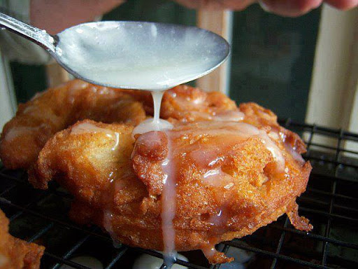 Combine flour, sugar, salt, baking powder, cinnamon. Stir in milk and egg until just combined. Fold in apple. Pour oil into skillet so that it is approximately 1 1/2 deep. Heat oil on high. Oil is ready when a little dough thrown in floats to top. Carefully add dough to oil in heaping teaspoons. Cook until brown, about 2 minutes, then flip. Cook another 1-2 minutes, until both sides are browned. Transfer briefly to paper towels to absorb excess oil, then transfer to cooling rack. Make glaze by stirring milk and powdered sugar together in a small bowl. Drizzle over apple fritters. Wait approximately 3 minutes for glaze to harden, then flip fritters and drizzle glaze over the other side. Best served warm.