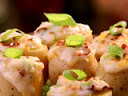 In a large Dutch oven, place the potatoes and enough water to cover and bring to a boil. Boil until just tender, about 8 minutes. Drain and let cool. Cut the potatoes in half crosswise. Cut a thin slice off the round end of each potato half to stand upright. Using a melon baler, scoop out the centers of the potatoes, leaving a 1/4-inch thick shell. Reserve the potato pulp.
