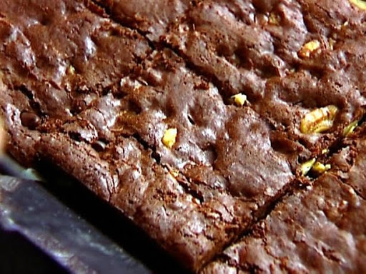 Stir together the flour, baking powder and salt. Add to cooled chocolate mixture. Toss the walnuts and chocolate chips with flour to coat. Then add to the chocolate batter. Pour into prepared pan.