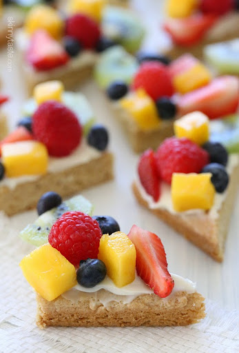 Cut the bars into 15 large squares (5 cuts by 3 cuts with the knife). Then cut each square in half diagonally to create triangles. Spread the frosting in a thin, even layer over the surface of the cookie, leaving a small margin around the edges. Layer the fresh fruit over the frosting. Store in the refrigerator until ready to serve.