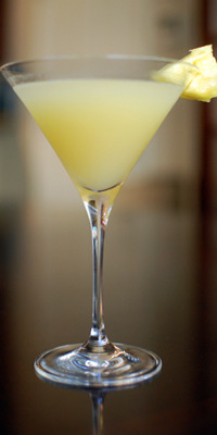 Pour into a chilled martini glass and garnish it with a fresh chunk of pineapple.