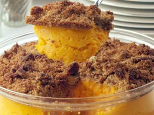To prepare topping: Mix flour, brown sugar, orange juice concentrate, oil and butter in a small bowl. Blend with a fork or your fingertips until crumbly. Stir in pecans. Sprinkle over the sweet potato mixture.
