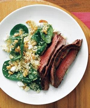 3. Wipe out the skillet. Cook the remaining 2 tablespoons of oil, the garlic, and pine nuts over medium heat, stirring, until golden, 2 to 3 minutes. Fold into the couscous with the spinach, Feta, lemon juice, and 1/2 teaspoon each salt and pepper. Serve with the steak.