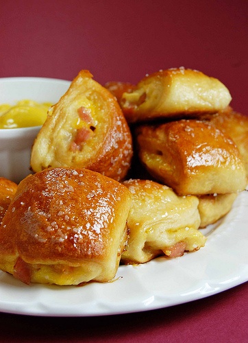 Turn out the dough onto a lightly floured surface. Divide into 4 equal pieces. Lightly dust your hands and rolling pin with flour. Roll one of the four sections into a 12×4-inch rectangle. With the long side facing you, gently press 1/4 of the ham and cheese into the bottom third of the dough, and roll as tightly as possible, starting with the end that has the filling. Cut into 12 1-inch pieces and transfer to a sheet pan lined with parchment paper. Repeat with remaining 3 portions of the dough.