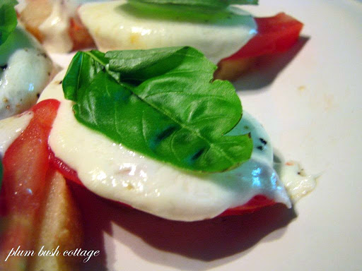 Arrange the toasts on a serving platter. Top each toast with a basil leaf. Using the brush, drizzle the remaining olive oil over the basil. Sprinkle with salt and pepper, and serve.