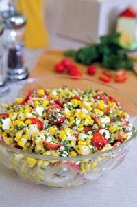 1.In a large stockpot or Dutch oven, bring water to a boil over high heat. Cook corn in boiling water for 5 to 7 minutes, or until just tender. Cool slightly. Cut kernels off corn and place in a medium bowl.