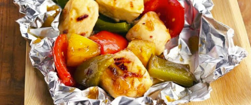 Cut 4 (24x12-inch) sheets of heavy-duty foil. Divide chicken, bell peppers, pineapple chunks and pineapple preserves mixture among foil sheets. Sprinkle with salt. Bring up 2 sides of foil so edges meet. Seal edges, making tight 1/2-inch fold; fold again, allowing space for heat circulation and expansion. Fold other sides to seal.