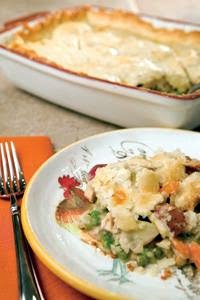 4.Add chicken, new potatoes, and sautéed vegetables, and simmer until mixture is heated through. Place in a 13-x-9-inch ovenproof baking dish.