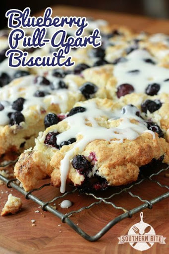 Preheat the oven to 425 degrees F. Line a baking sheet with parchment paper or silicone baking mat, or lightly spray it with non-stick cooking spray. In a large bowl, whisk together the baking mix and the sugar. Add about half of the blueberries to the mixture and lightly toss. Add 1/2 cup of whipping cream and the melted butter. Fold gently until the mixture is just combined and a dough forms. (Some of the berries will burst, don't worry.)Turn the dough out onto the prepared baking sheet. Carefully press it into a rectangle that is about 10 inches by 7 inches. Pour the remaining berries on top of the dough and press them lightly into the dough. Using a paring knife, score the dough to make 12 to 15 biscuits. Bake 15 to 17 minutes or until the biscuits are golden brown. Make the glaze by combining the remaining 1/2 cup whipping cream with the 2 cups of powdered sugar. Mix well. Drizzle over the warm biscuits.