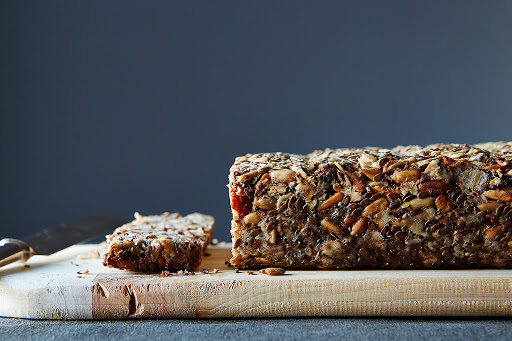 In a flexible, silicon loaf pan or a standard loaf pan lined with parchment, combine all dry ingredients, stirring well. Whisk maple syrup, oil, and water together in a measuring cup. Add this to the dry ingredients and mix very well until everything is completely soaked and dough becomes very thick (if the dough is too thick to stir, add one or two teaspoons of water until the dough is manageable). Smooth out the top with the back of a spoon. Let sit out on the counter for at least 2 hours, or all day or overnight. To ensure the dough is ready, it should retain its shape even when you pull the sides of the loaf pan away from it or lift the parchment. Preheat oven to 350° F / 175° C. Place loaf pan in the oven on the middle rack, and bake for 20 minutes. Remove bread from loaf pan, place it upside down directly on the rack and bake for another 30 to 40 minutes. Bread is done when it sounds hollow when tapped. Let cool completely before slicing. Store bread in a tightly sealed container for up to five days. Freezes well too – slice before freezing for quick and easy toast!