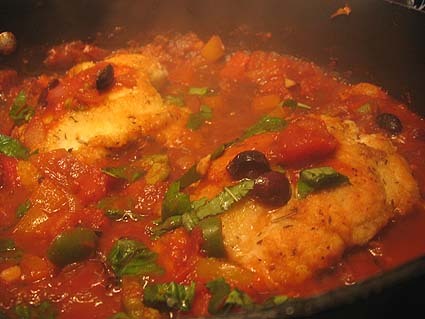 Coat & cook chicken; remove. Sautee veg & add thru olives. Add chicken back and simmer. Top with parsley.