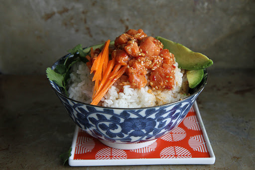 Top each bowl with half of the spicy salmon and spoon some of the sauce over the top. Serve immediately.