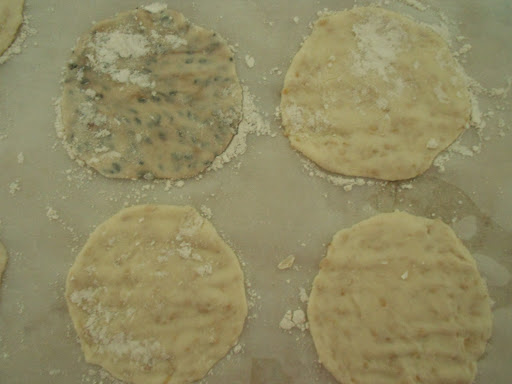 Cover a baking sheet with parchment paper. Lay the pieces onto the sheet, leaving about 3 inches space between each piece. With flour dusted fingers, push each piece into a very flat, about 2 to 2 1/2 inch round.