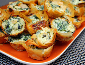 I decided to use my mini muffin pan to create phyllo cups, which I filled with a standard spanakopita filling.