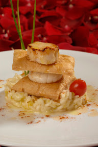Para el montaje: formar al centro de cada plato un timbal de risotto, usando un aro de acero. Colocar un callo de hacha, poner la pasta philo formando una pequeña torre y salsear con el vino