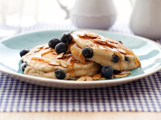 Arrange 2 pancakes on each of 4 plates. Top each serving with 1 tablespoon of the syrup and 1 teaspoon of the almonds. Serve with the remaining blueberries.