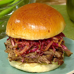Pile the pulled pork onto soft buns and top with slaw, some sweet pickles, mustard, cilantro and enjoy.
