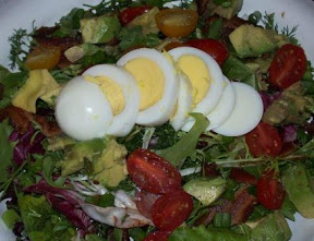 Mix olive oil, vinegar, salt and pepper. Toss with mixed greens. Plate and top with remaining ingredients.