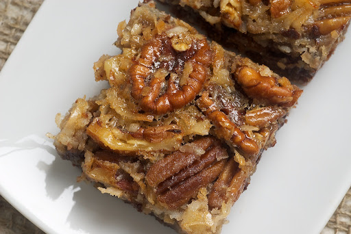 Place eggs in a large mixing bowl, and beat lightly. Add brown sugar, corn syrup, and melted butter. Whisk together until smooth. Stir in coconut and pecans. Pour evenly over partially baked crust.