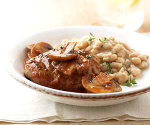 In saucepan cook garlic in the 2 tablespoons hot olive oil for 1 minute. Stir in beans; coarsely mash. Stir in chicken broth (up to 1/4 cup) to moisten beans. Stir in thyme and lemon juice. Season to taste with salt and pepper; heat through. To serve, drizzle with olive oil. Makes 4 servings.