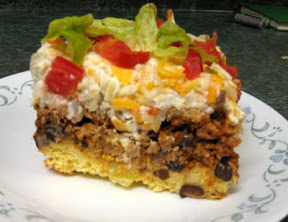 In a large bowl, combine the corn bread, egg and milk until blended. Spread into an 8 x 8 pan sprayed with cooking spray. Bake at 350 for 15 minutes. Combine taco meat and beans, spread over corn bread. Combine sour cream, 3/4 cup cheese and onion. Spread over meat mixture. Bake for 20 - 25 minutes longer or until heated through and cheese is melted. Sprinkle with tomato, lettuce and remaining 1/4 cup of cheese.