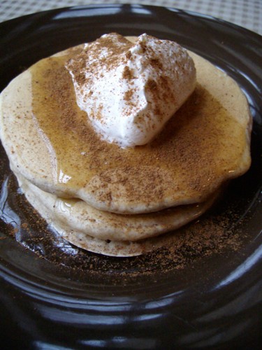 Top pancakes with syrup, light whipped topping, and cinnamon and nutmeg for the perfect holiday breakfast