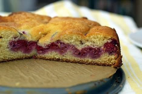 Scatter raspberries evenly over top and sprinkle with remaining 1 1/2 tablespoons sugar. Bake until cake is golden and a wooden pick inserted into center comes out clean, 25 to 30 minutes. Cool in pan 10 minutes, then turn out onto a rack and cool to warm, 10 to 15 minutes more. Invert onto a plate.