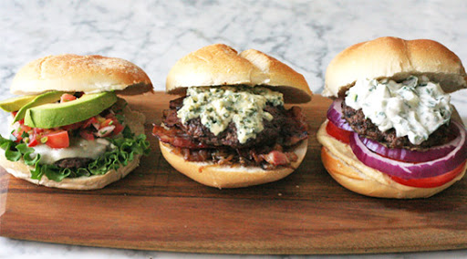 5. Make the Steakhouse: In a medium skillet, cook the bacon over medium-low heat until crisp, 5 to 6 minutes. Remove from the pan and drain on paper towels. Add the sliced onion to the pan, season with pepper, and cook until golden brown and caramelized, 15 to 17 minutes. Spoon 2 to 3 tablespoons caramelized onions onto the bottom half of the bun. Top with the burger and a rounded ⅓ cup scoop of crumbled blue cheese. Cover with the top half of the bun and serve immediately.
