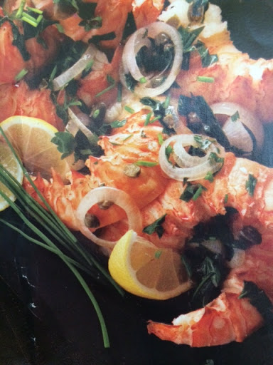 3. Meanwhile turn heat to medium-high. Add parsley & capers to skillet with 1/2 cup wine. Bring to a boil. Remove from heat & stir in butter until just melted. Spoon mixture over lobster. Top with chives & serve with lemon wedges.