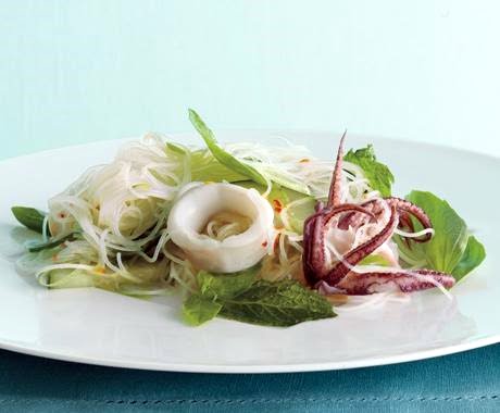 Cold noodle dishes are a great way to cool off, and since both calamari and rice-stick noodles require little cooking, the combination makes for an excellent lunch or dinner on a hot, lazy day. With its generous amount of fragrant garden herbs, this salad even smells refreshing.