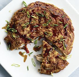 Wipe out the skillet with paper towels. Heat the remaining 2 Tbs. oil over medium-high heat until shimmering hot. Add the egg mixture, reduce the heat to medium, and cook, running a spatula in short, circular motions along the bottom of the pan, until the eggs begin to set, 2 to 3 minutes. Reduce the heat to low and gently press on the eggs with the spatula to flatten them. Cook until the eggs are just firm to the touch, about 2 minutes. Set a large plate over the pan and flip the eggs onto the plate so the bottom faces up. Drizzle with the oyster sauce mixture, sprinkle with the scallion greens, and serve.