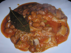 - En una sartén de bordes altos coloque aceite y una vez caliente sude la cebolla, cuando este transparente, incorpore la panceta, cocine unos minutos y agregue el chorizo colorado, luego de unos minutos de cocción incorpore el mondongo, sazone con sal y pimienta, mezcle y agregue las papas, cocine unos minutos e incorpore la zanahoria y el apio, corrija con sal a medida que agregue los ingredientes. - Incorpore el ajo, el laurel, orégano y perejil picado, mezcle bien y luego de 10 minutos de cocción agregue el puré de tomates junto con los frijoles, sazone con pimentón, mezcle y cubra con agua fría, deje cocinar a fuego lento hasta que estén cocidos todos los ingredientes.