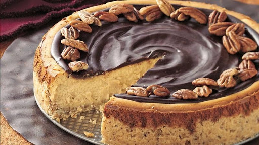 Heat 1 tablespoon brown sugar, 1 tablespoon butter and the pecan halves in 8-inch nonstick skillet over low heat, stirring frequently, until sugar is melted and pecans are toasted. Spread on waxed paper; cool 5 minutes. Arrange sugared pecans along edge of top of cheesecake. Cool 2 hours at room temperature. Refrigerate 4 hours or overnight. Run metal spatula along side of cheesecake to loosen; remove side of pan. Store covered in refrigerator.
