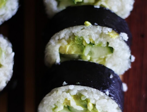 Evenly spread the rice onto the nori sheets and then layer on the plants; roll it up and have a party!