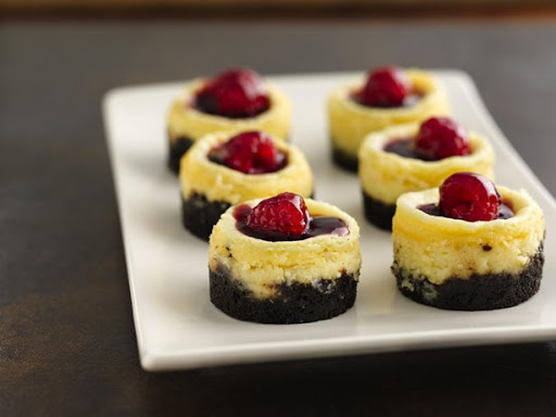 Bake 20 to 25 minutes or until set. Cool completely in pan, about 30 minutes. Refrigerate at least 2 hours or overnight. Remove from pan. Serve cheesecakes topped with raspberries and drizzled with raspberry jelly.