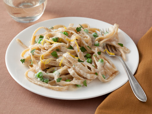 4. Stir in the peas until heated through, 2 minutes. Toss in the cooked pasta, Parmesan cheese and about 1/2 cup of pasta water until the noodles are coated but the sauce is still loose.
