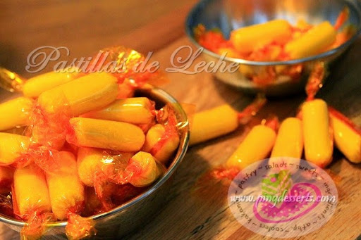 Cut wax paper or cellophane into rectangle with 1½ inches larger than your desired size of pastillas de leche “milk candy”. Prepare extra milk powder and refined sugar on a separate bowls and set aside. Scoop some of the milk mixture, and using your clean hands make a ball. If it’s a bit sticky just dunk in a bowl of extra powdered milk, shake off excess and roll into cylinders until smooth and shiny.