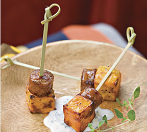4. Place 1 sausage slice on top of 1 sweet potato cube; secure with a wooden pick. Repeat with remaining sausage slices and potato cubes.