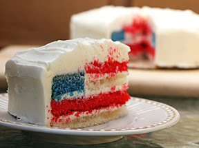 To make cake, you use three layers of white batter. Using food coloring, one layer is dyed blue, one is dyed red, and last layer is kept white. Divide batter in three equal parts (it’s about 9 cups total batter.). Pour one color of batter into one of 3 prepared pans, smoothing tops with spatula. Bake 25-30 minutes, rotating halfway through, or until thin knife inserted in middle comes out clean. Cool in the pans five minutes, then turn out onto a cooling rack.