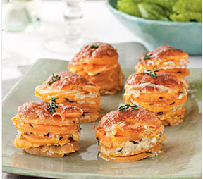 1. Preheat oven to 375°. Layer half of sweet potatoes in a lightly greased 12-cup muffin pan. Sprinkle with 1 1/2 tsp. thyme and 1/2 cup cheese. Top with remaining sweet potatoes. (Potatoes will come slightly above the rim of each cup.)