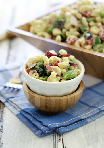 Prepare all of the vegetables, then add them and any remaining ingredients except bacon to the large bowl with the pasta. Stir until the ingredients are evenly distributed. Chill for 1 hour, or up to 24 hours before serving.