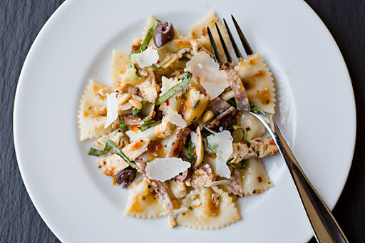 -Add the sauteed tomatoes directly into the bowl of a food processor, and add in the remainder of the ingredients (don’t forget to add the remaining 2 tablespoons olive oil); pulse a few times, then process for a moment just until well blended and fairly smooth; check the salt/pepper level to see if you need to add more, then transfer to a small, snap-top container, and keep in fridge with pasta salad until ready to use. (*If the vinaigrette becomes a bit thick from being in the fridge, just run the container under hot water to warm it up, and shake well before using.)