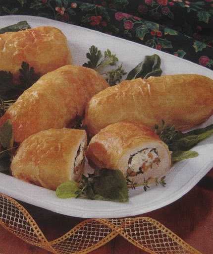 Unroll puff pastry; cut into eight portions. Roll each into a 8 in x 7 in. rectangle. Combine egg and cold water; brush over edges of pastry. Place chicken at one short end; roll up tightly, tucking in ends. Place on a greased 15 x 10 x 1 in baking sheet. Bake at 350° for 25-30 mn. or until golden brown.